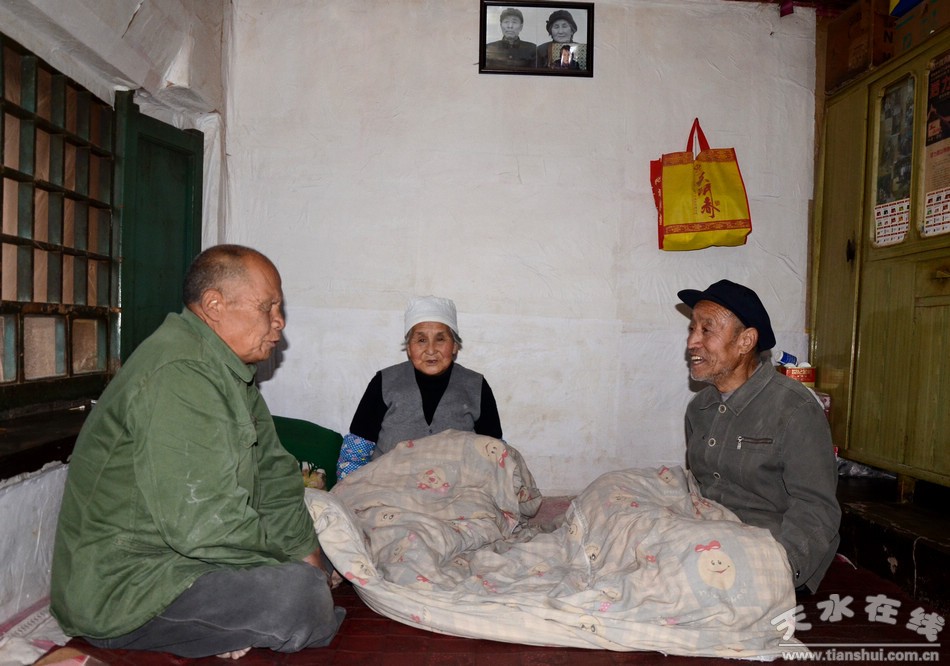 清水縣土門鄉(xiāng)豐盛村地處縣城西北山區(qū)約60公里,12月26日上午,記者來到劉引菊家時,她正在后院忙著整理柴垛!皠倧暮笊绞傲诵┎瘢o他王爺把炕燒上了,這兩天降溫天太冷,柴禾不能斷!眲⒁者呎f邊將眾人引進屋?簧献焕先,同蓋一床被,鄰居王啟財正美滋滋地喝了一口罐罐茶,聊著從收音機里聽來的趣聞,引得另兩位老人嘿嘿直樂。