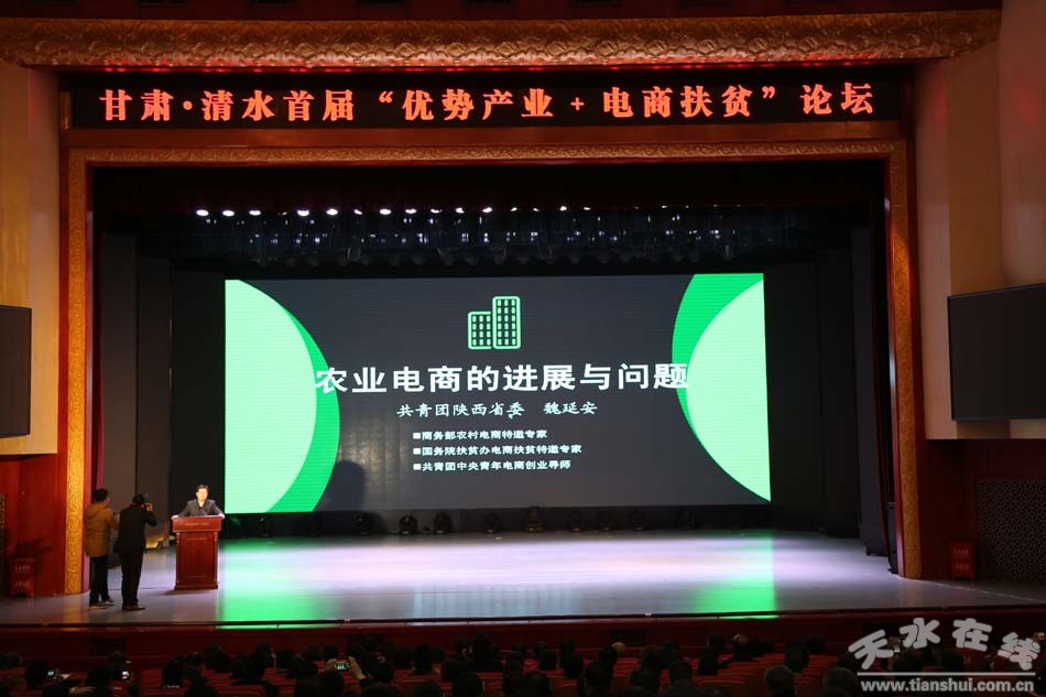10月21日上午10時,甘肅•清水首屆“優(yōu)勢產(chǎn)業(yè)+電商扶貧”論壇正式啟幕,天水市委常委、副市長宮輝,省商務廳電商處副處長孔軍到會指導,市商務局、市扶貧辦、市農(nóng)業(yè)局、市畜牧局、市教育局、市果業(yè)辦等市直單位及甘谷、武山、秦安、秦州等兄弟縣區(qū)組團參加,清水縣四大組織領(lǐng)導,縣直及鄉(xiāng)鎮(zhèn)負責同志,260個行政村黨支部書記及第一書記、電商創(chuàng)業(yè)者參加,秦州區(qū)玉泉鎮(zhèn)煙鋪村40多名果農(nóng)更是遠道而來聆聽講座,軒轅大劇院座無虛席,這是清水電商發(fā)展征程中的盛事,更是激蕩全縣黨政干部和電商創(chuàng)業(yè)者思想的盛宴。