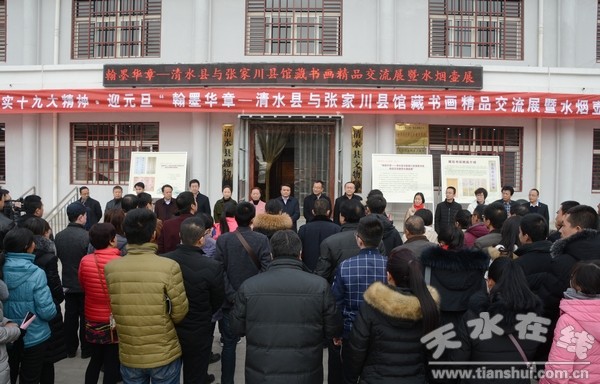 翰墨凝香,丹青煥彩。12月29日,在清水縣博物館舉行貫徹落實(shí)黨的十九大精神•迎元旦“翰墨華章一清水•張家川兩縣館藏書畫精品交流展暨水煙壺展覽”。清水縣人大常委會(huì)主任周偉東,張家川縣委常委、宣傳部長(zhǎng)薛林榮,清水縣委常委、宣傳部長(zhǎng)盧芳,清水縣人大常委會(huì)副主任畢德祥,張家川縣副縣長(zhǎng)汪萍,清水縣副縣長(zhǎng)李寶玲、張軍,清水縣政協(xié)副主席曹鳳娥出席啟動(dòng)儀式;張家川縣文廣局、文化館、文物局、云鼎陶陳列館、麥積區(qū)博物館、秦安縣博物館負(fù)責(zé)人及清水縣縣直單位部分干部職工,部分書畫、收藏愛(ài)好者,兩縣文化系統(tǒng)干部共計(jì)120余人參加了啟動(dòng)儀式。