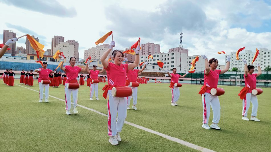 比賽開始,集體舞《奮進(jìn)新時代》的鼓點躍動全場,所有隊員邁著整齊劃一的步伐,她們精神抖擻、意氣風(fēng)發(fā)。緊隨其后的《中國范兒》《中國紅》《中國夢》等廣場舞表演中,健身操、扇子舞、響扇舞輪番上演、精彩紛呈。腰鼓表演《好日子》尤為亮眼,清脆的鼓聲中,舞者們?nèi)箶[飄揚、瀟灑唯美,燦爛的笑容讓舞臺極具感染力,現(xiàn)場喝彩歡呼聲不斷。