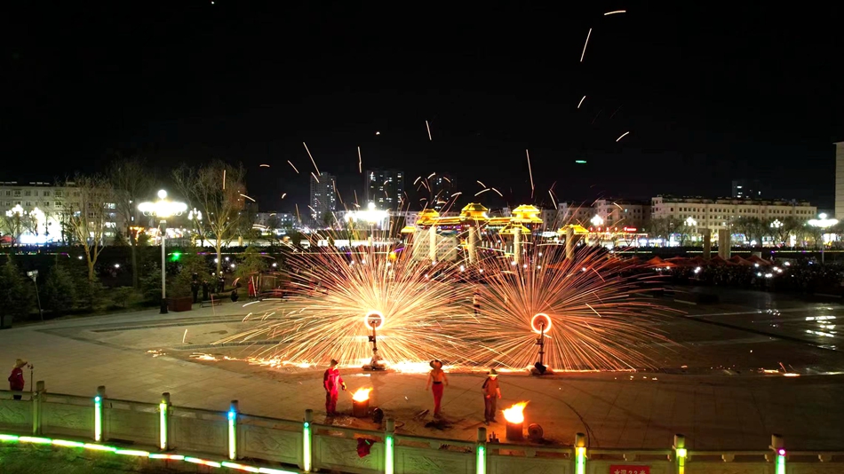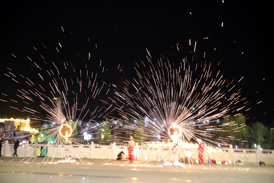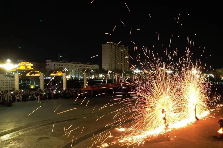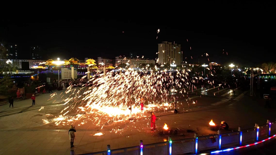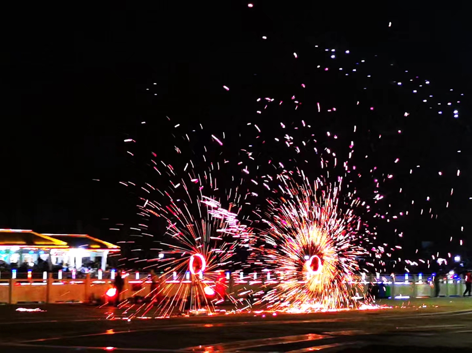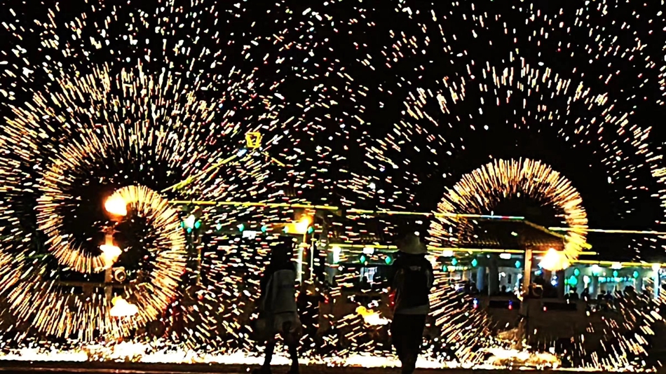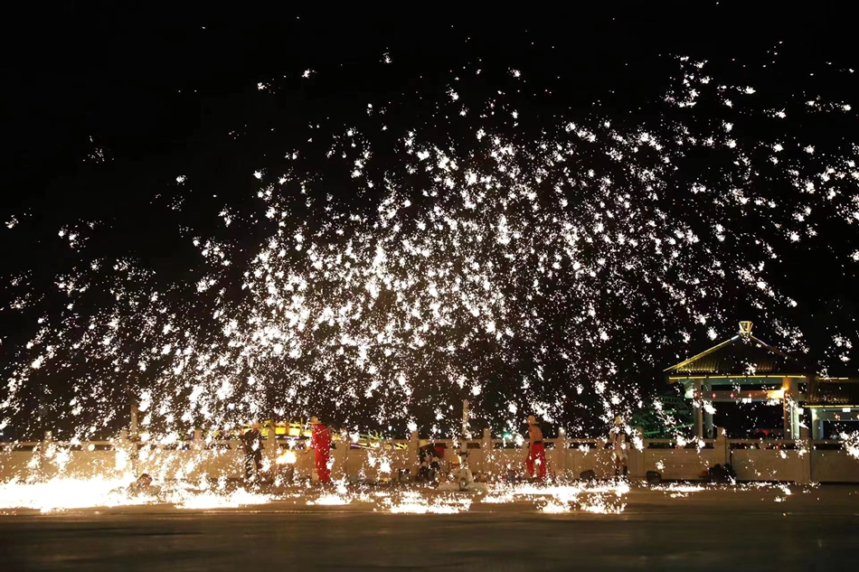身懷絕技的非遺匠人們手持花棒,先將一勺勺通紅的鐵水灑向天空,接著揮舞手中的花棒。在花棒的擊打下,鐵水沖向天空迸散開(kāi)來(lái),瞬間在空中炸開(kāi)化為絢爛鐵花。流星如瀑、光芒四射、聲震天宇,引得游客驚嘆連連。