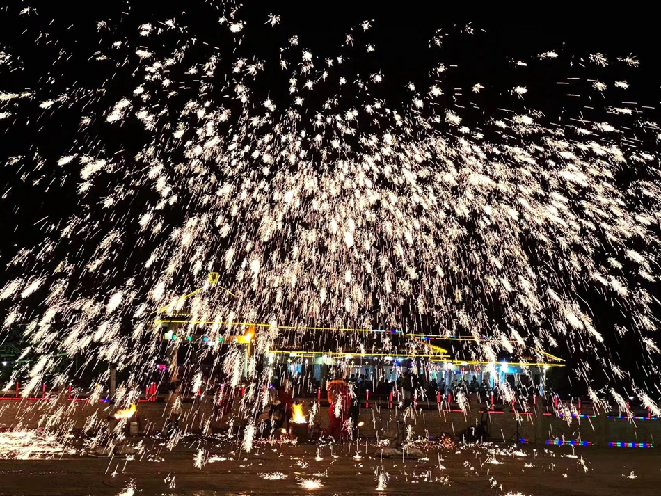 表演現(xiàn)場(chǎng),一串串耀眼的鐵花在空中散開(kāi),璀璨奪目、絢麗震撼。鐵花沖破漆黑的夜空綻放,像滿(mǎn)天繁星雨點(diǎn)般落下,如流星滑落般令人驚艷,萬(wàn)千火花瞬間四散開(kāi)來(lái),寂靜的夜空被立刻點(diǎn)亮。