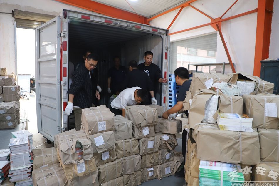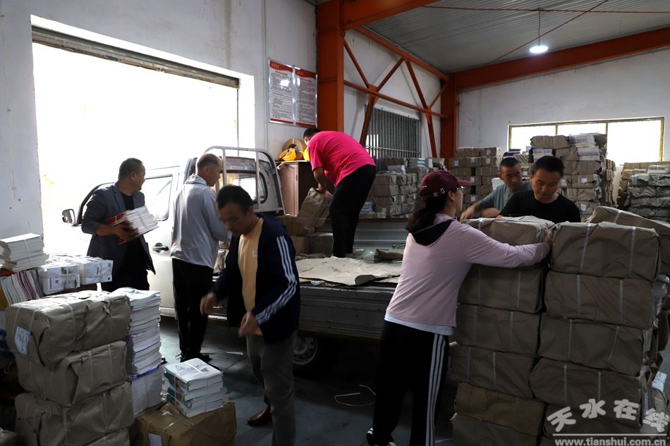 在清水縣新華書店的教材倉庫內(nèi),各類教材、教輔倚墻整齊碼放,堆積如山,工作人員分工明確,有的負責將整包的新教材從運輸車上卸下來,再用手推車運到指定堆放地點,有的專注于對各中小學校的教材進行分類清點、分發(fā)、打包。