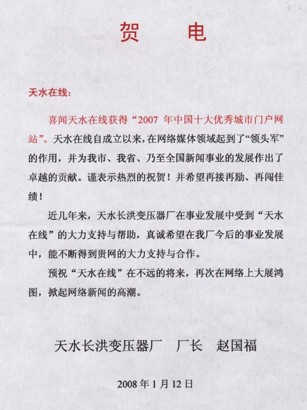 天水長(zhǎng)洪變壓器廠電賀“天水在線”獲獎(jiǎng)