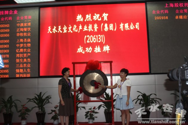 6月17日,隨著“天寶文化”股權(quán)托管掛牌上市儀式在上海股權(quán)托管交易中心隆重舉行(股權(quán)代碼:206131)。標(biāo)志著天寶文化產(chǎn)業(yè)投資(集團(tuán))有限公司正式登陸資本市場(chǎng)。天水市工商聯(lián)副主席左沁芳、甘肅省江蘇商會(huì)副會(huì)長柏傳祥、天水市經(jīng)濟(jì)合作發(fā)展中心副主任王多軍、天水市中小企業(yè)投融資服務(wù)中心副主任魏志剛及天寶文化集團(tuán)主要負(fù)責(zé)人參加了掛牌儀式。