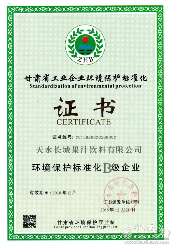 甘肅省工業(yè)企業(yè)環(huán)境保護(hù)標(biāo)準(zhǔn)化B級(jí)企業(yè)證書