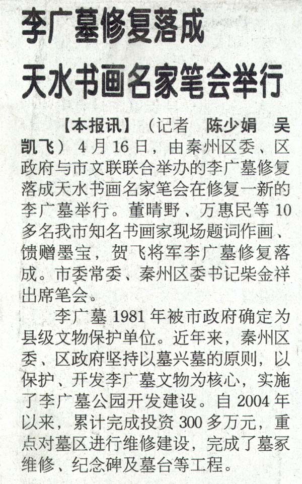 【本報(bào)訊】 (記者 陳少娟 吳凱飛)4月16日,由秦州區(qū)委、區(qū)政府與市文聯(lián)聯(lián)合舉辦的李廣墓修復(fù)落成天水書畫名家筆會在修復(fù)一新的李廣墓舉行。董晴野、萬惠民等10多名我市知名書畫家現(xiàn)場題詞作畫、饋贈墨寶,賀飛將軍李廣墓修復(fù)落成。市委常委、秦州區(qū)委書記柴金祥出席筆會。