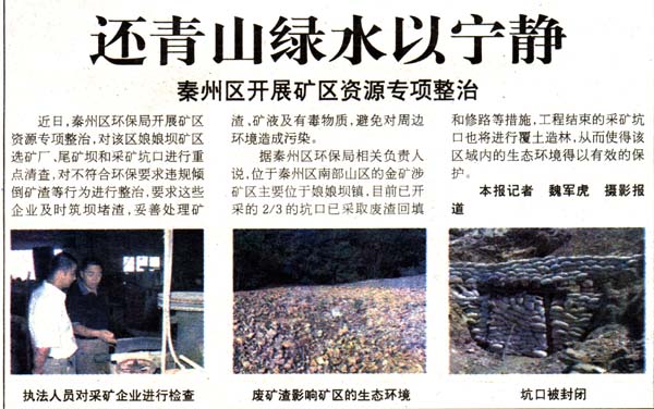 據(jù)秦州區(qū)環(huán)保局相關(guān)負(fù)責(zé)人說,位于秦州區(qū)南部山區(qū)的金礦涉礦區(qū)主要位于娘娘壩鎮(zhèn),目前已開采的2/3的坑口已采取廢渣回填和修路等措施,工程結(jié)束的采礦坑口也將進(jìn)行覆土造林,從而使得該區(qū)域內(nèi)的生態(tài)環(huán)境得以有效的保護(hù)。