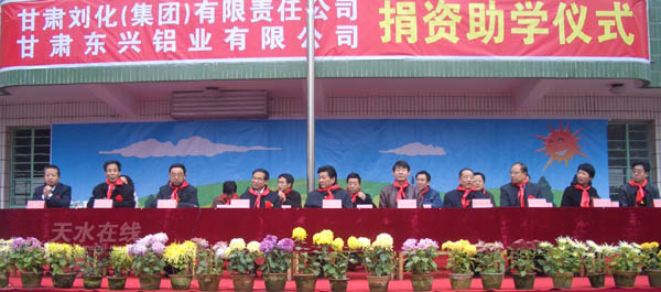 。ㄇ刂輩^(qū)委宣傳部 裴振剛)12月8日上午,天氣雖然寒冷,但秦州區(qū)解放路第一小學校園內(nèi),處處洋溢著融融的暖意。這天,該校迎來了甘肅劉化(集團)有限責任公司、甘肅東興鋁業(yè)有限公司為本校捐資助學這一盛大喜事。市委書記、市人大常委會主任虞海燕,市委常委、秦州區(qū)委書記張健,市人大常委會副主任任伯年,市政協(xié)副主席陶元德,市長助理彭鴻嘉,甘肅劉化(集團)有限責任公司董事長馬山林,甘肅東興鋁業(yè)有限公司經(jīng)理劉萬祥等出席了捐資活動。