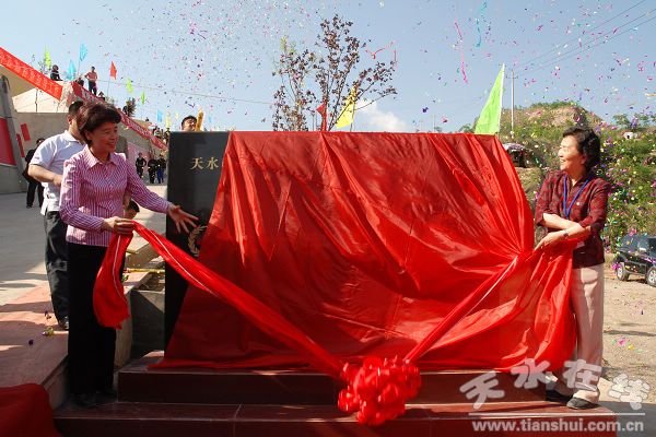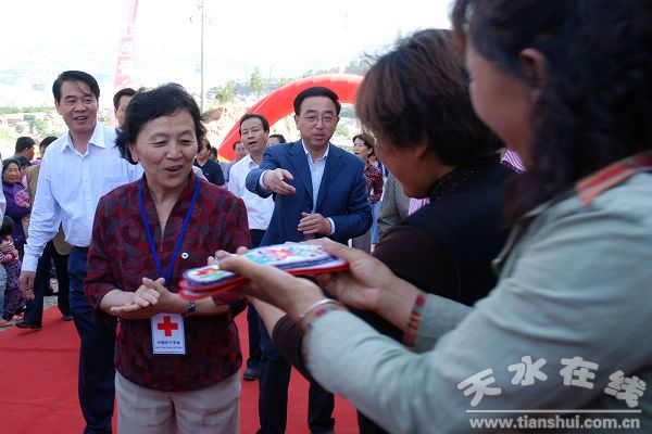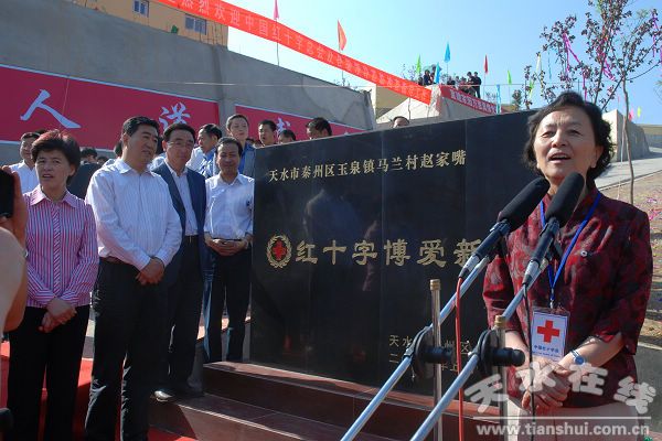 中國紅十字會黨組書記、常務副會長江亦曼,甘肅副省長咸輝為紅十字博愛新村揭碑