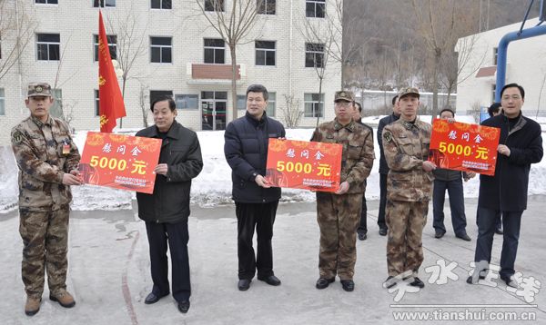 慰問(wèn)中,張明泰等與駐區(qū)部隊(duì)官兵親切座談,向他們致以誠(chéng)摯的祝福和敬意,讓駐區(qū)部隊(duì)廣大官兵土氣大振,所到之處,掌聲陣陣,經(jīng)久不息。張明泰說(shuō),一年來(lái),部隊(duì)對(duì)秦州經(jīng)濟(jì)社會(huì)建設(shè)和維護(hù)社會(huì)和諧穩(wěn)定做出了積極貢獻(xiàn),在“8•12”搶險(xiǎn)救災(zāi)中,給予了大力支持和幫助,真正體現(xiàn)了軍民一家親、一條心,軍地魚水情深的關(guān)系得到不斷深化;今后,我們會(huì)一如繼往地做好擁軍工作,急部隊(duì)之所急、想部隊(duì)之所想,希望通過(guò)我們的共同努力,譜寫更加壯麗的軍地魚水和諧樂(lè)章。