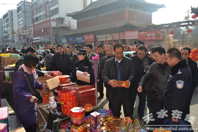(秦州區(qū)外宣辦 李保懷)為了確保公共安全和消費(fèi)者的人身財產(chǎn)安全,進(jìn)一步規(guī)范煙花爆竹市場,2月4日,秦州區(qū)領(lǐng)導(dǎo)毛更生、康泰來帶領(lǐng)安監(jiān)、公安、質(zhì)監(jiān)、綜合執(zhí)法、工商等部門負(fù)責(zé)人和執(zhí)法人員,對新華路、藉河北路煙花爆竹市場進(jìn)行了專項檢查。