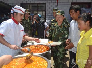 走進(jìn)村主任許牛牛的家,他的妻子趙淑琴面露難色地介紹說,村子里行動(dòng)不便的老人小孩被轉(zhuǎn)移出去,其余女性也都轉(zhuǎn)移出去照顧老人小孩,青壯年留下配合部隊(duì)救援,她便主動(dòng)承擔(dān)為救援人員做飯的任務(wù),但米面油糧消耗很大,幾天下來,已經(jīng)到了斷炊的程度。得知這一情況后,支隊(duì)政委蓋國(guó)欽在送央視記者進(jìn)災(zāi)區(qū)采訪的時(shí)候,專門裝載了6袋米面,以及一些蔬菜和食用油。考慮到災(zāi)區(qū)停電,做飯極為不便,武警官兵還運(yùn)來了一套煤氣灶;趙女士一個(gè)人平均每天為40余村民做飯,負(fù)擔(dān)重壓力大,支隊(duì)針對(duì)這種情況,專門派來一位有等級(jí)廚師證的炊事員。轉(zhuǎn)移的村民把自己從災(zāi)區(qū)帶出來的少量“救命糧”慰問部隊(duì)官兵,都被官兵一一婉言謝絕。視人民利益為最高準(zhǔn)則,用愛托起明天的太陽,用心演繹魚水深情,用情打造希望的綠洲,這是官兵始終秉持的原則。
