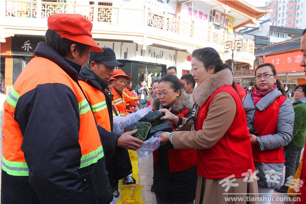為進(jìn)一步弘揚(yáng)“奉獻(xiàn)、友愛(ài)、互助、進(jìn)步”的志愿精神,并感謝秦州環(huán)衛(wèi)工人一直以來(lái)為我們城市的干凈整潔所做出的突出貢獻(xiàn),12月5日上午,國(guó)際志愿者日當(dāng)天,共青團(tuán)市委副書(shū)記張興、共青團(tuán)市委權(quán)益部部長(zhǎng)馮濤、共青團(tuán)區(qū)委書(shū)記李軍、天水青年志愿者指導(dǎo)中心和天水愛(ài)心協(xié)會(huì)的志愿者一行,慰問(wèn)了秦州區(qū)的10名特困環(huán)衛(wèi)工人,對(duì)他們的辛勤付出表示了感謝,并送上了大米、食用油、手套、圍巾、鞋等慰問(wèn)品。