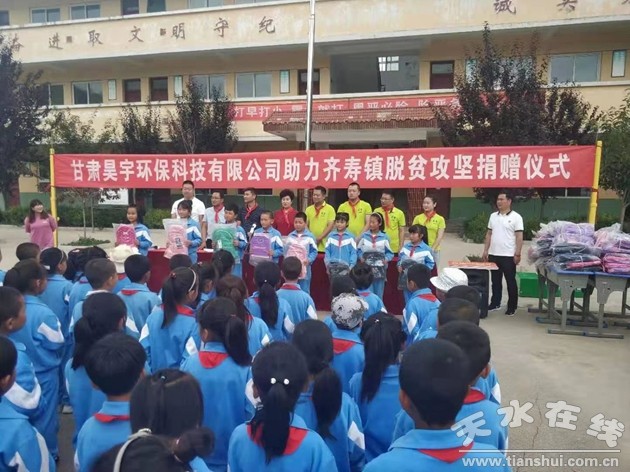 為助推齊壽鎮(zhèn)困難群眾脫貧步伐, 近日,愛(ài)心企業(yè)甘肅昊宇環(huán)?萍加邢薰驹邶R壽鎮(zhèn)松李小學(xué)舉行了以“聯(lián)系愛(ài)心企業(yè) 助推脫貧攻堅(jiān)”為主題的“獻(xiàn)愛(ài)心·助脫貧”捐助活動(dòng);顒(dòng)中,甘肅昊宇環(huán)保科技有限公司向齊壽鎮(zhèn)6戶(hù)危改對(duì)象(含4戶(hù)建檔立卡戶(hù),2戶(hù)低保戶(hù))每戶(hù)資助建房資金0.8萬(wàn)元,向含有建檔立卡戶(hù)內(nèi)學(xué)生在內(nèi)的全鎮(zhèn)93名小學(xué)生捐贈(zèng)愛(ài)心書(shū)包、文具等93套價(jià)值1萬(wàn)元,捐贈(zèng)總額5.8萬(wàn)元。