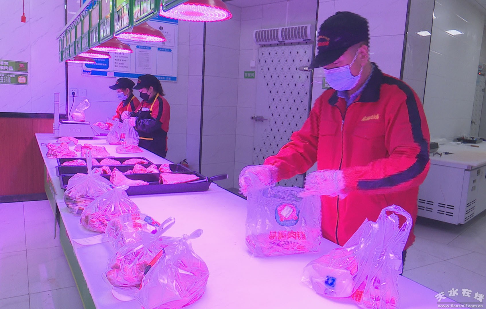隨后,記者來(lái)在山水嘉園品高肉鋪看到,工作人員正在忙碌著分揀配送的鮮肉。