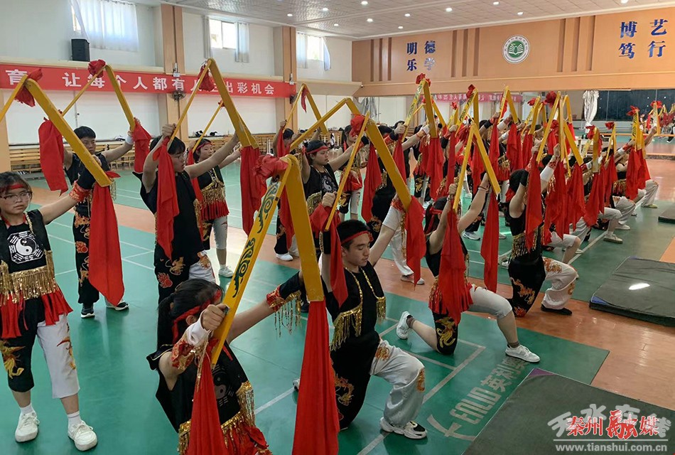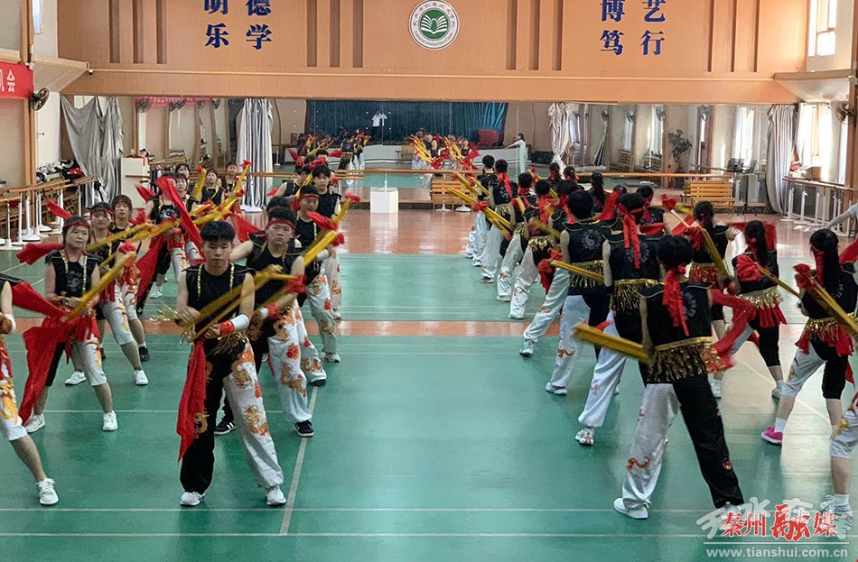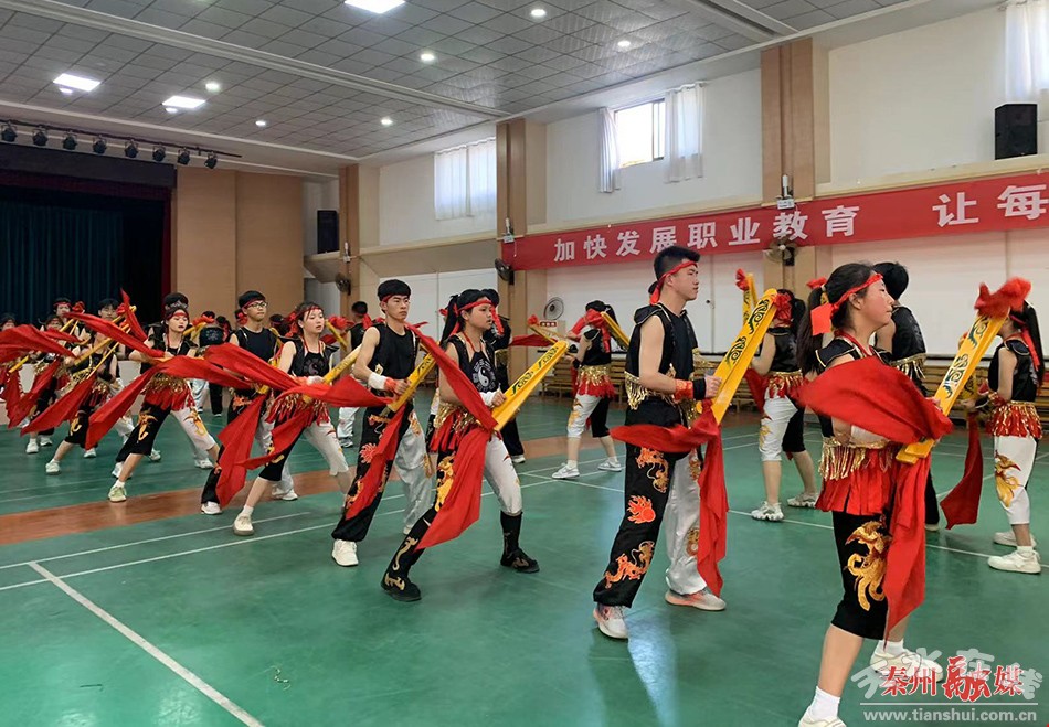 在天水市職業(yè)技術(shù)學(xué)校的禮堂內(nèi),36名身著黑衣、頭結(jié)紅繩的學(xué)生,手持夾板,在伴奏的引導(dǎo)下,列隊(duì)排練,他們動(dòng)作剛健瀟灑,舞步整齊劃一,神態(tài)嚴(yán)肅虔誠(chéng)。