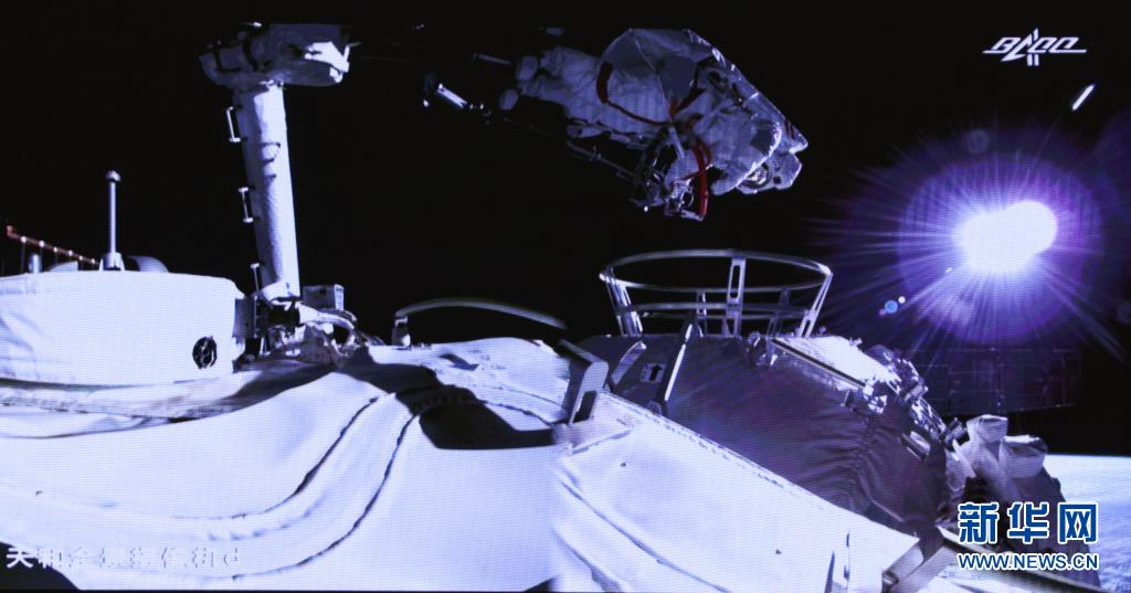 7月4日,在北京航天飛行控制中心大屏拍攝的航天員在艙外工作場面。新華社記者 金立旺 攝