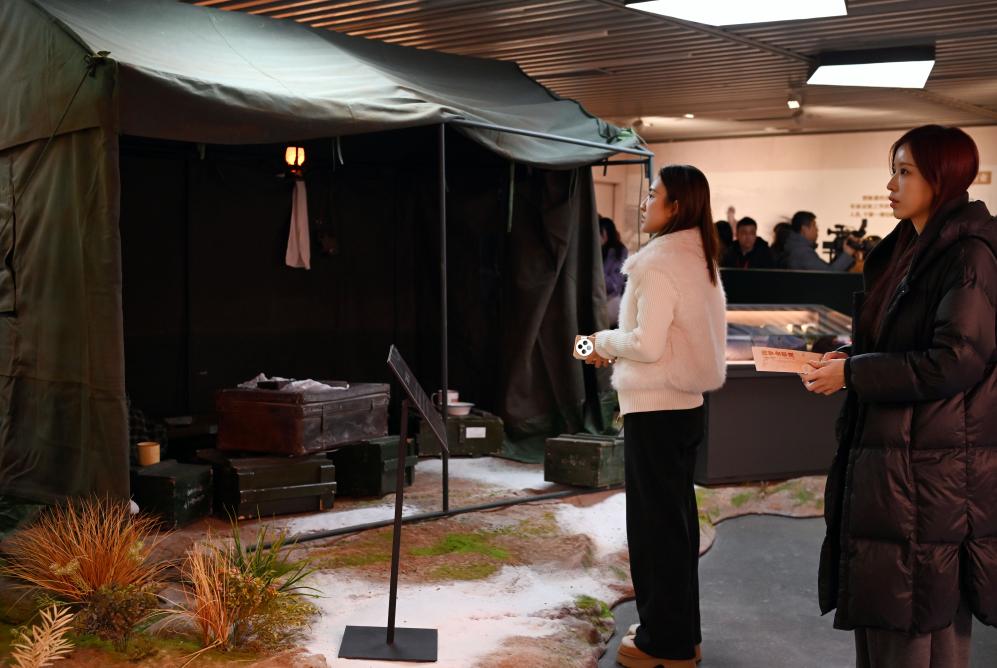 1月7日,觀眾在展覽現(xiàn)場參觀中國首個(gè)核武器研制基地——青海省海北州金銀灘“三頂帳篷起家”的復(fù)原場景。新華社記者劉穎 攝