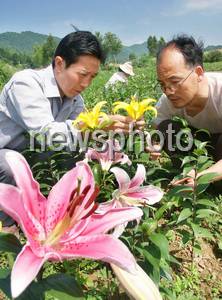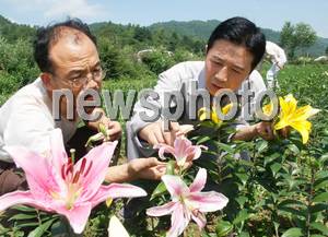 2005年8月4日,甘肅省天水市農(nóng)科所的兩名科技人員在基地觀察從荷蘭引進(jìn)的東方百合的生長(zhǎng)情況。