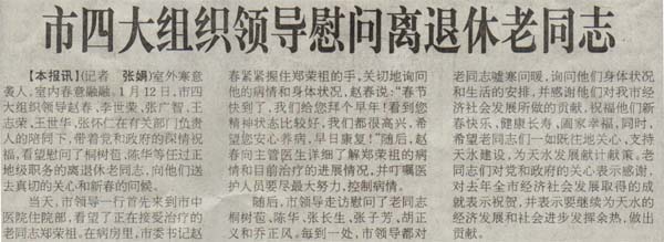 【本報(bào)訊】(記者張娟)室外寒意襲人,室內(nèi)春意融融。1月12日,市四大組織領(lǐng)導(dǎo)趙春、李世榮、張廣智、王志榮、王世華、張懷仁在有關(guān)部門負(fù)責(zé)人的陪同下,帶著黨和政府的深情祝福,看望慰問了桐樹苞、陳華等任過正地級(jí)職務(wù)的離退休老同志,向他們送去真切的關(guān)心和新春的問候。