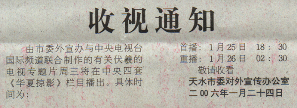 由市委外宣辦與中央電視臺國際頻道聯(lián)合制作的有關(guān)伏羲的電視專題片周三將在中央四套《華夏掠影》欄目播出。具體時間為: