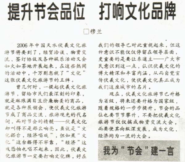 曾幾何時,一提起伏羲文化旅游節(jié),留給市民們最深刻的印象,就是琳瑯滿目且價廉物美的商品,就是各種展銷會,使伏羲文化旅游節(jié)成了商品交流、旅游觀光的代名詞,而對節(jié)會的精髓——伏羲文化卻叫得不是那么響亮。雖說是“文化搭臺,經(jīng)濟唱戲”,但如果“文化”這臺搭得不牢靠,“經(jīng)濟”這戲恐怕也唱不起來。因此,伏羲文化旅游節(jié)一定要打響文化牌。好在我們的領(lǐng)導(dǎo)已對此重視起來,但這種意識不能僅僅停留在領(lǐng)導(dǎo)層面,更重要的是要讓東道主——廣大市民意識到這一點,認(rèn)識伏羲文化的博大精深和豐富內(nèi)涵,從而自覺宣傳伏羲文化,使伏羲文化真正成為我們這座城市的名片。