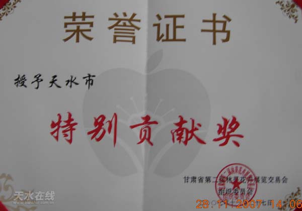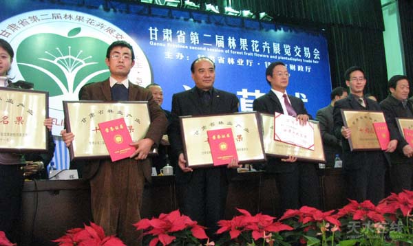 為表彰天水市委、市政府對林果產(chǎn)業(yè)的重視和在帶動(dòng)全省經(jīng)濟(jì)林果業(yè)的發(fā)展方面做出的貢獻(xiàn),甘肅省第二屆林果花卉展覽交易會組織委員會決定授予天水市“特別貢獻(xiàn)獎(jiǎng)”,獲得此獎(jiǎng)項(xiàng)的只有天水市和平?jīng)鍪袃杉摇A硗馕沂羞獲得了組織獎(jiǎng)和布展一等獎(jiǎng)。