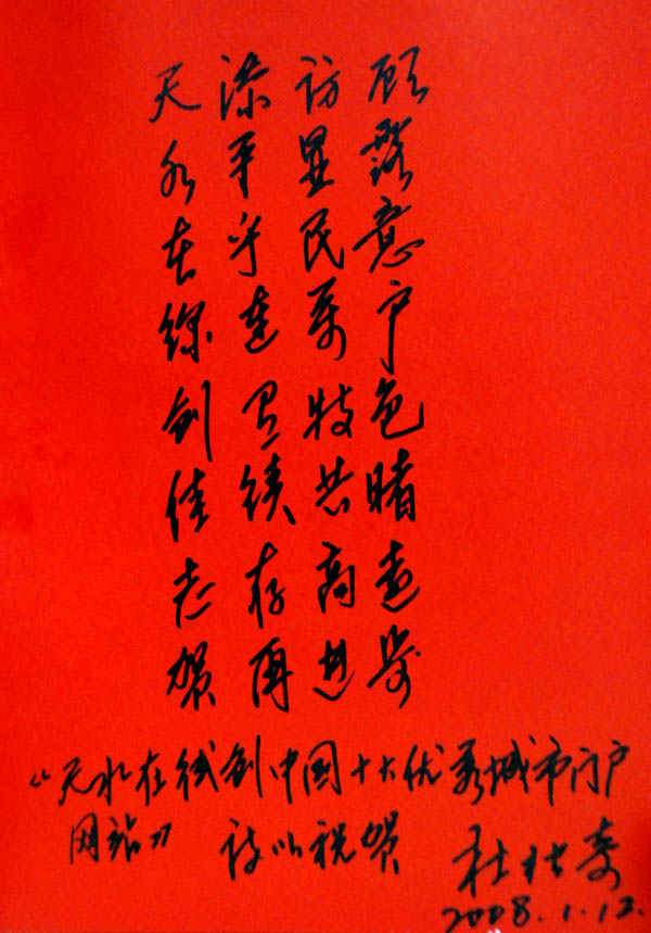 天水師范學(xué)院黨委書(shū)記杜松奇題詩(shī)祝賀“天水在線”榮獲“2007中國(guó)十大優(yōu)秀城市門(mén)戶網(wǎng)站”稱(chēng)號(hào)。
