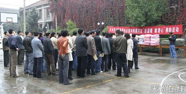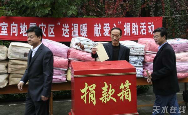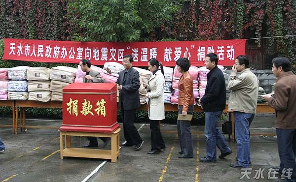 天水在線報道 10月15日上午,天水市政府辦公室向地震災(zāi)區(qū)“送溫暖 獻(xiàn)愛心”捐助活動在市政府大院舉行。