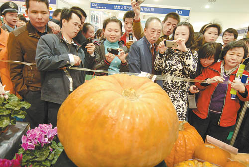 在A館“天水綠鵬農(nóng)業(yè)”展位前,閃光燈一直閃個(gè)不停,人們紛紛與大南瓜合影。記者湊上前去,只見(jiàn)一個(gè)色澤鮮艷、重192斤、直徑0.7米的南瓜儼然成了眾人的偶像,一位市民伸開(kāi)雙臂欲抱住這個(gè)大南瓜,卻以失敗告終!暗脙蓚(gè)人才能抱住”。周?chē)娜诵χf(shuō)。