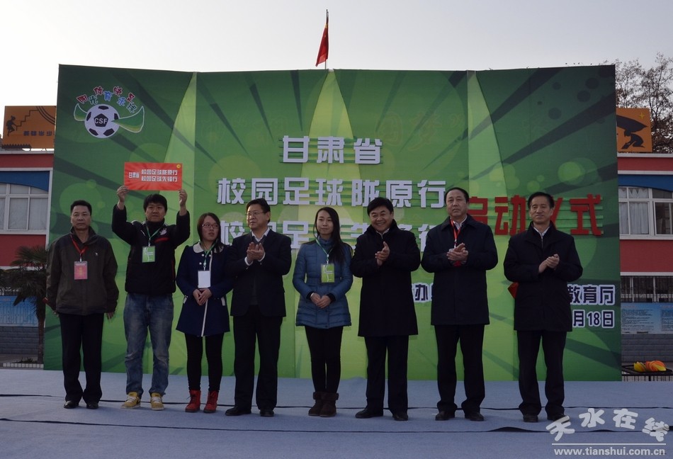 12月18日,甘肅省“校園足球隴原行”和“校園足球先鋒行” 在天水市麥積區(qū)實(shí)驗(yàn)小學(xué)舉行了啟動(dòng)儀式。省教育廳黨組成員、總督學(xué)李晶和天水市副市長(zhǎng)張建杰向參加這項(xiàng)活動(dòng)的采訪媒體授旗。