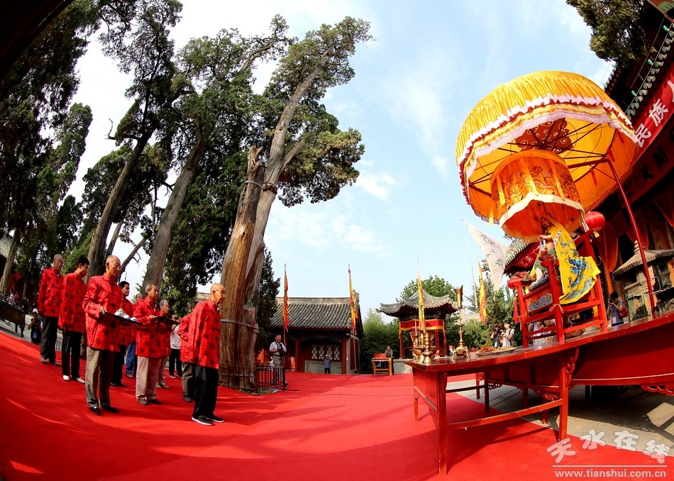 8月31日,天水伏羲廟內(nèi)龍旗獵獵,嗩吶陣陣,在先天殿月臺(tái)伏羲行像前悠揚(yáng)的古琴演奏聲中,浩大的祭祀隊(duì)伍按照傳統(tǒng)禮儀,舉行迎神,取圣水,出榜文等儀式,標(biāo)志著乙未(2015)年秋祭中華民族人文始祖太昊伏羲氏典禮正式開始,數(shù)萬市民和游客觀看了第一天的祭祀典禮儀式。