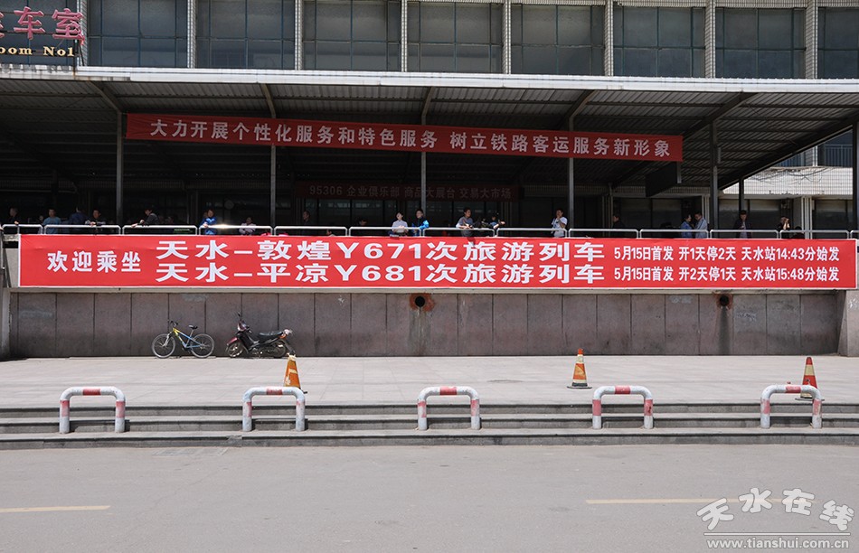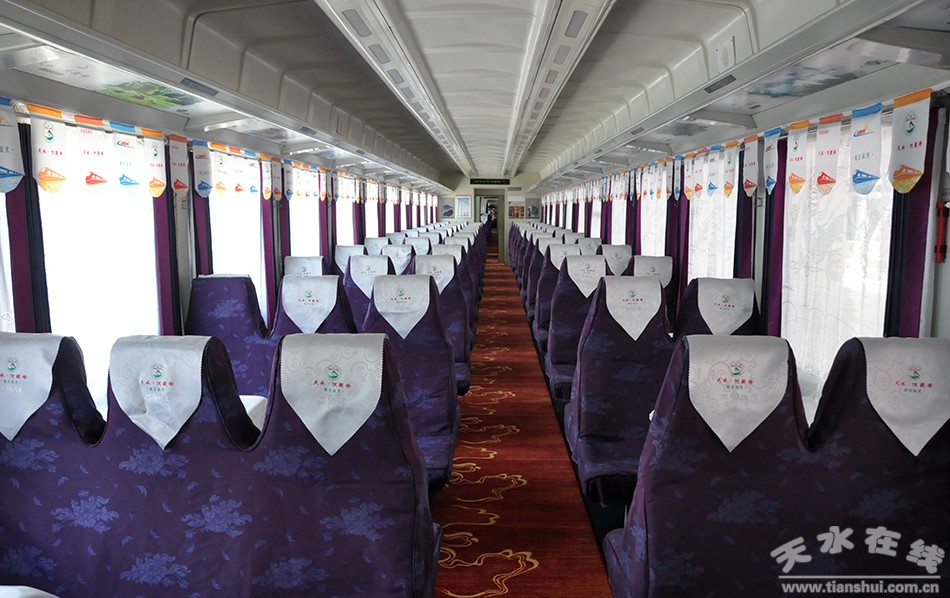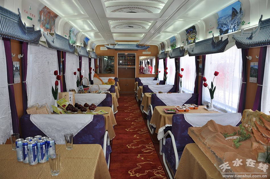 5月15日,天水至敦煌“天水·伏羲號”環(huán)形旅游列車鳴笛發(fā)車。該趟列車是天水市真正意義上的首趟始發(fā)列車。使用1組25K型車體,列車編組14節(jié),其中軟臥1節(jié)、硬臥6節(jié)、硬座4節(jié)、餐車1節(jié)、行李車1節(jié)、發(fā)電車1節(jié);全程軟臥下鋪票價497.5元、硬臥下鋪325.5元、硬座177.5元。天水火車站14時43分始發(fā),途經隴西、蘭州、武威、金昌、張掖、嘉峪關、瓜州站,第二日8時56分終到敦煌站,單程運行里程1481km,用時18小時13分鐘,開1天停2天運行。