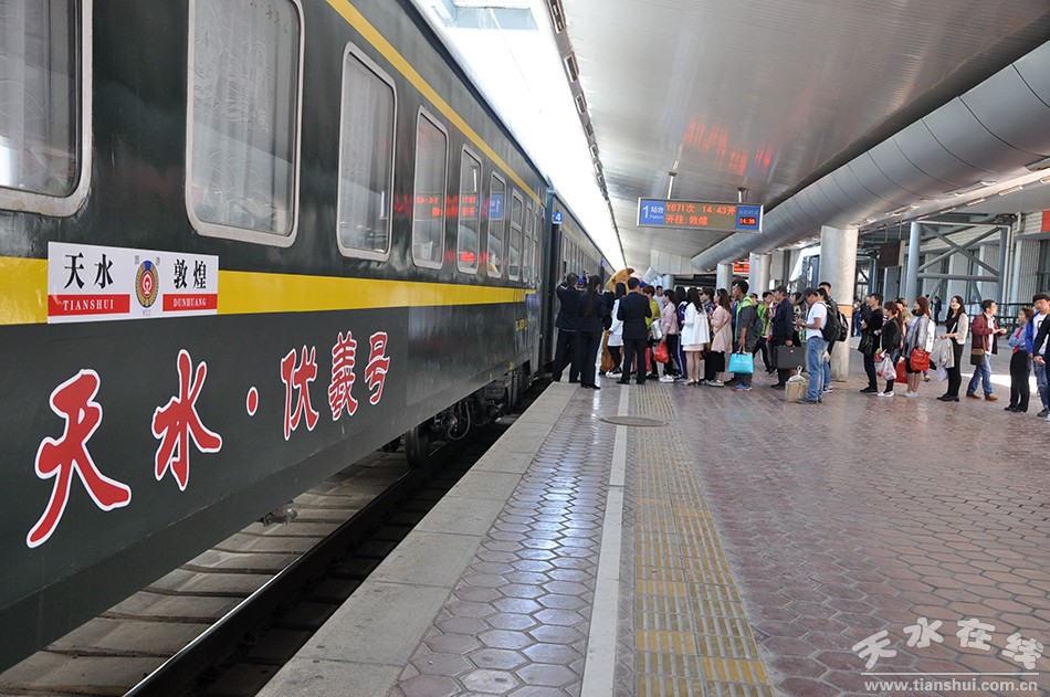 天水至敦煌“天水·伏羲號”的 Y671次列車是天水市真正意義上的首趟始發(fā)列車。使用1組25K型車體,列車編組14節(jié),其中軟臥1節(jié)、硬臥6節(jié)、硬座4節(jié)、餐車1節(jié)、行李車1節(jié)、發(fā)電車1節(jié);全程軟臥下鋪票價497.5元、硬臥下鋪325.5元、硬座177.5元。天水火車站14時43分始發(fā),途經隴西、蘭州、武威、金昌、張掖、嘉峪關、瓜州站,第二日8時56分終到敦煌站,單程運行里程1481km,用時18小時13分鐘,開1天停2天運行。