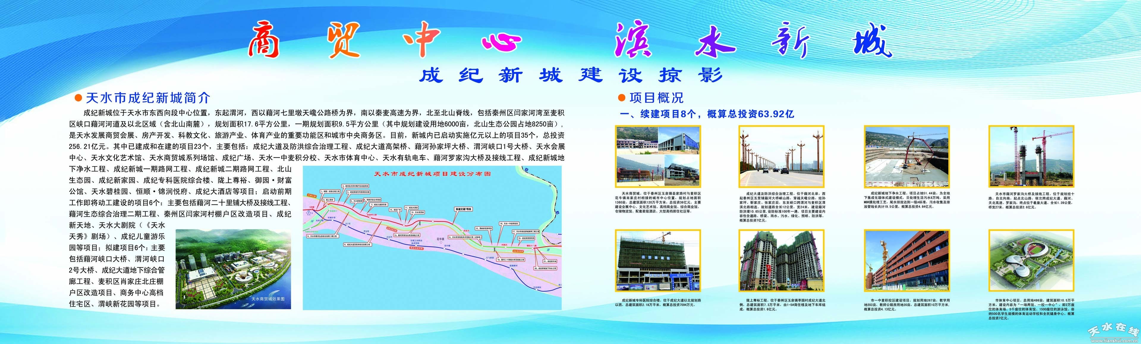 成紀(jì)新城位于天水市東西向段中心位置,東起渭河,西以藉河七里墩天巉公路橋為界,南以秦麥高速為界,北至北山脊線,包括秦州區(qū)閆家河灣至麥積區(qū)峽口藉河河道及以北區(qū)域(含北山南麓),規(guī)劃面積17.6平方公里,一期規(guī)劃面積9.5平方公里(其中規(guī)劃建設(shè)用地6000畝,北山生態(tài)公園占地8250畝),是天水發(fā)展商貿(mào)會展、房產(chǎn)開發(fā)、科教文化、旅游產(chǎn)業(yè)、體育產(chǎn)業(yè)的重要功能區(qū)和城市中央商務(wù)區(qū)。目前,新城內(nèi)已啟動實施億元以上的項目35個,總投資256.21億元。其中已建成和在建的項目23個,主要包括:成紀(jì)大道及防洪綜合治理工程、成紀(jì)大道高架橋、藉河孫家坪大橋、渭河峽口1號大橋、天水會展中心、天水文化藝術(shù)館、天水商貿(mào)城系列場館、成紀(jì)廣場、天水一中麥積分校、天水市體育中心、天水有軌電車、藉河羅家溝大橋及接線工程、成紀(jì)新城地下凈水工程、成紀(jì)新城一期路網(wǎng)工程、成紀(jì)新城二期路網(wǎng)工程、北山生態(tài)園、成紀(jì)新家園、成紀(jì)?漆t(yī)院綜合樓、隴上尊裕、御園•財富公館、天水碧桂園、恒順•錦潤悅府、成紀(jì)大酒店等項目;啟動前期工作即將動工建設(shè)的項目6個:主要包括藉河二十里鋪大橋及接線工程、藉河生態(tài)綜合治理二期工程、秦州區(qū)閆家河村棚戶區(qū)改造項目、成紀(jì)新天地、天水大劇院(《天水天秀》劇場)、成紀(jì)兒童游樂園等項目;擬建項目6個:主要包括藉河峽口大橋、渭河峽口2號大橋、成紀(jì)大道地下綜合管廊工程、麥積區(qū)肖家莊北莊棚戶區(qū)改造項目、商務(wù)中心高檔住宅區(qū)、渭峽新花園等項目。
