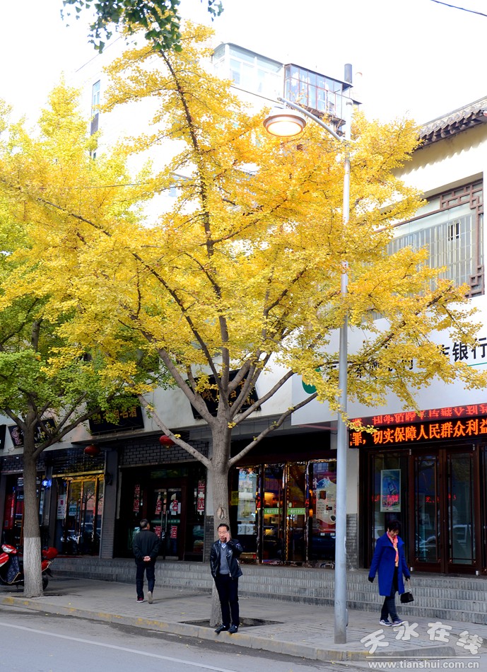 天水在線攝影報道:連日來,天水城區(qū)的銀杏樹披上了金黃的盛裝,分外美麗妖嬈,成為天水城一道靚麗的風(fēng)景。