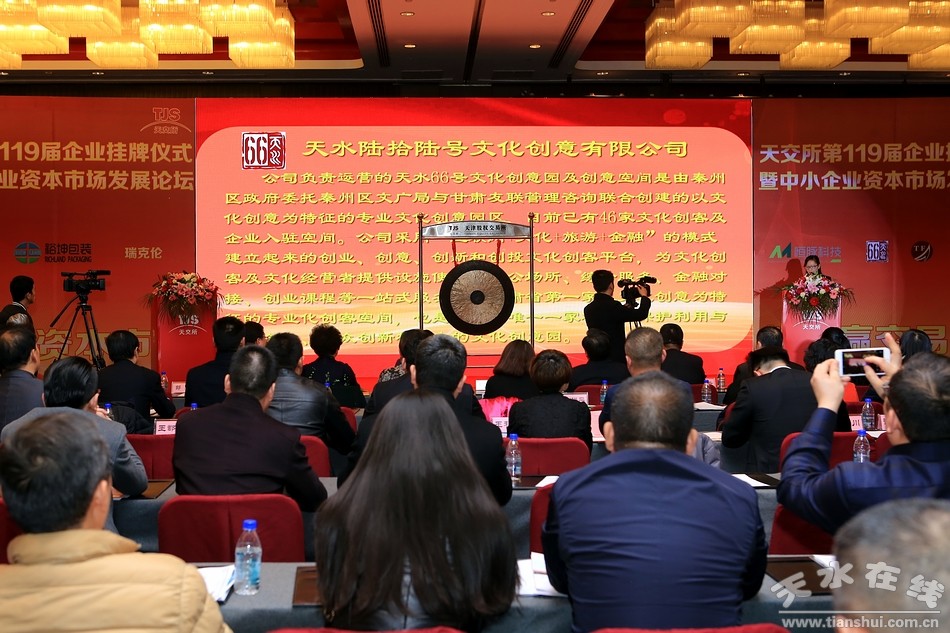 11月28日,天水66號文化創(chuàng)意有限公司在天津股權(quán)交易所掛牌,成為全省進入股權(quán)資本市場的第一家文化創(chuàng)意企業(yè),邁開了我省文化雙創(chuàng)企業(yè)進入資本市場第一步。同日,天水市另一家企業(yè)——甘肅天峰資產(chǎn)管理有限公司也在天津股權(quán)交易所掛牌。