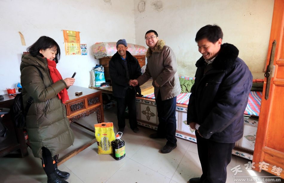 山下已是冰雪消融,山上仍是白雪皚皚。踏著仍被冰雪覆蓋的道路,2017年1月20日(農(nóng)歷臘月二十三),團(tuán)市委書(shū)記王龍強(qiáng)、天水市美通進(jìn)出口貿(mào)易有限責(zé)任公司總經(jīng)理?xiàng)钗撵o、天水市中醫(yī)院腦血管科醫(yī)師李建軍、天水市青年攝影家協(xié)會(huì)主席王誠(chéng)一行十余人深入聯(lián)系點(diǎn)武山縣龍臺(tái)鎮(zhèn)龍山村開(kāi)展“春節(jié)慰問(wèn)”活動(dòng),深入了解困難群眾的生活,并給他們送去了黨的溫暖、關(guān)懷及節(jié)日的祝福,幫助他們度過(guò)一個(gè)詳和歡樂(lè)的節(jié)日。