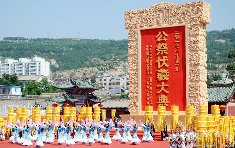 6月22日上午9時50分,在天水伏羲廟和臺灣臺北市同步舉行了主題為“傳承伏羲文化 弘揚中華文明”的2017(丁酉)年公祭中華人文始祖伏羲大典,這是第四次海峽兩岸共祭伏羲,表達(dá)了全體中華兒女對人文始祖伏羲創(chuàng)世功績的崇高敬仰和無限尊崇。