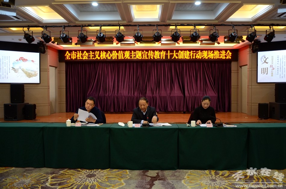 10月25日,在黨的十九大勝利閉幕之際,全市社會(huì)主義核心價(jià)值觀主題宣傳教育十大創(chuàng)建行動(dòng)現(xiàn)場會(huì)在麥積區(qū)召開。會(huì)上,學(xué)習(xí)宣傳黨的十九大精神,認(rèn)真貫徹落實(shí)全省社會(huì)主義核心價(jià)值觀主題宣傳教育十大創(chuàng)建行動(dòng)現(xiàn)場會(huì)議精神,安排部署我市持續(xù)開展社會(huì)主義核心價(jià)值觀主題宣傳教育十大創(chuàng)建行動(dòng),推動(dòng)全市社會(huì)主義核心價(jià)值觀培育實(shí)踐工作不斷向廣度和深度拓展。