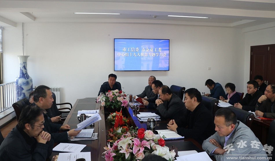 10月26日下午,天水市工信委、市企業(yè)工委理論學習中心組舉行專題學習會,深入學習黨的十九大報告精神,研究部署學習貫徹落實意見。會議由市工信委黨組書記、主任、市企業(yè)工委書記何曉斌同志主持,在家班子成員、副縣以上干部、兩委各科室負責同志共計30余人參加了會議。