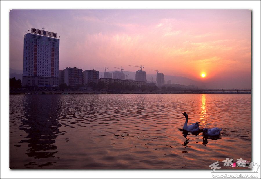 起初我對(duì)條河并不在意,蓄水成湖,動(dòng)水靜流,換個(gè)名堂罷了。居天水湖畔有七年了,就越感不太一樣了。春夏秋冬,總有景致,花草人事,自有奇麗。窗前有山,腳下有水,來(lái)過(guò)我這里朋友,幾乎都為此處景觀禁不住稱絕。確有點(diǎn)身在福中不知其福。倘臨高而望,貌似外灘,又比外灘恣意安祥。有時(shí)嘆想:天若能長(zhǎng),人當(dāng)更久。在天水聽秦腔不算稀奇,天水湖畔的秦腔會(huì)響徹南北兩山,可并不反感,倒覺得親切。其實(shí),天水湖最忠實(shí)的客人是逢季而至的那些候鳥,還有晨暮練身的中老年人。