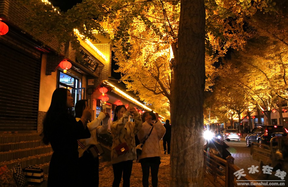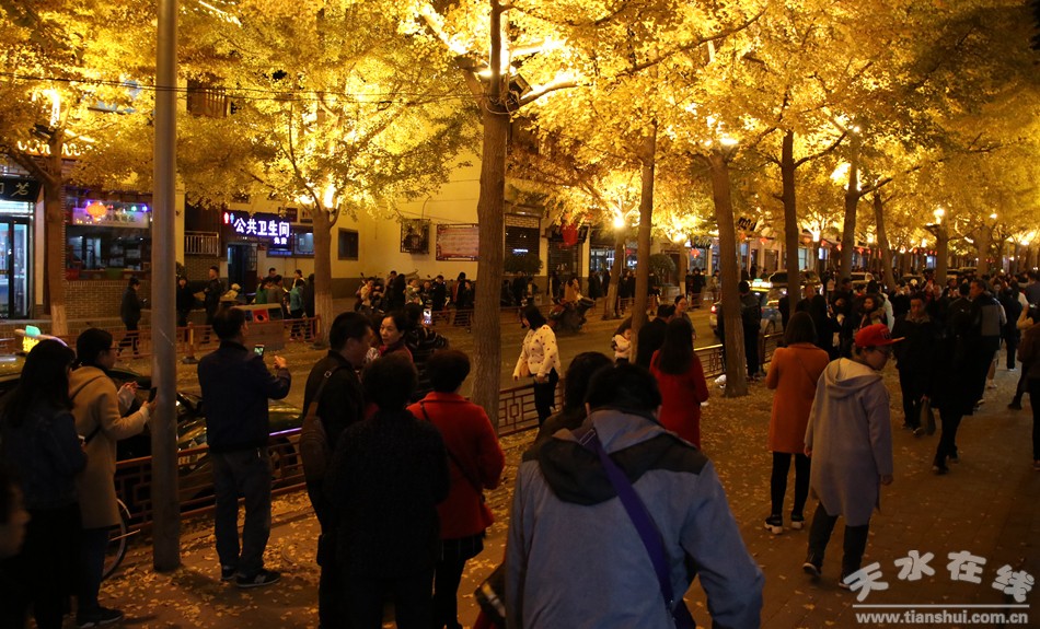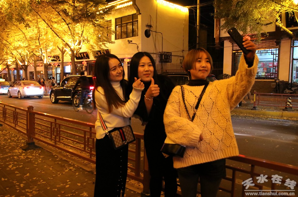 當(dāng)天晚上,雖然天氣寒冷,但是仍然阻擋不了充滿激情欣賞深秋美景的人們。不到七時(shí),來(lái)自四面八方的游人開(kāi)始向黃金大道集結(jié),不一會(huì),黃金大道上已經(jīng)人山人海,一直持續(xù)到晚上十點(diǎn)多。來(lái)觀賞游玩的有老人,有中年人,有年輕人,也有小孩;有本地的,也有被抖音吸引來(lái)自蘭州、西安、寶雞的網(wǎng)友。另外,大批抖音大軍正在搭乘飛機(jī)、高鐵,或自駕前來(lái)天水的路上。
