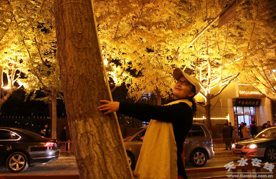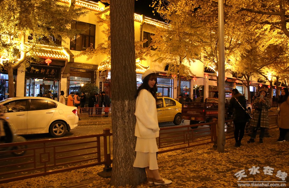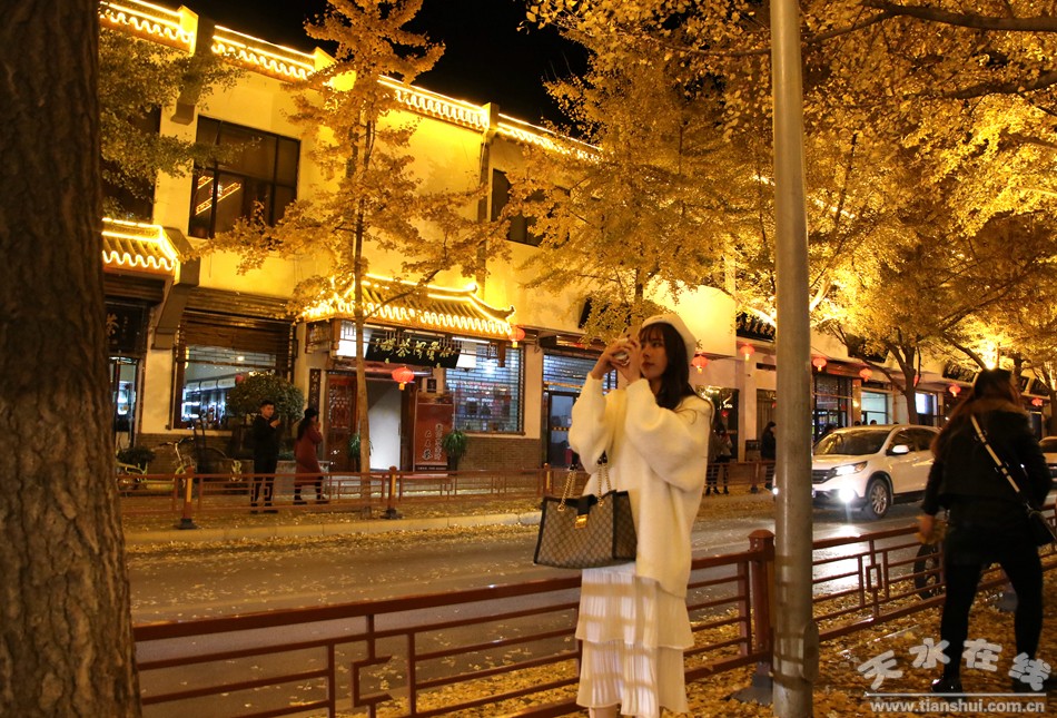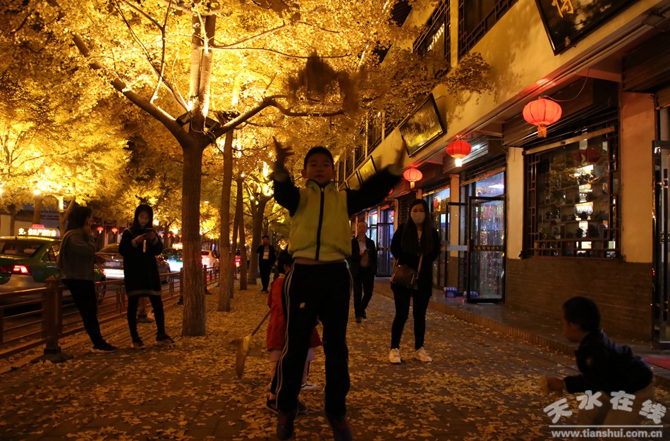 游人們?cè)谶@里,或駐足欣賞,或拍照,或自拍,或跳或舞,或錄制抖音短視頻,或網(wǎng)絡(luò)直播,玩的不亦樂(lè)乎,朋友圈和抖音平臺(tái)持續(xù)刷屏。有網(wǎng)友在接受小編采訪時(shí)說(shuō),今晚的天水真熱鬧,像過(guò)年一樣。 更有天水詩(shī)人牛跟道詩(shī)意大發(fā)賦詩(shī)一首(銀杏葉鋪黃金道<新韻)>):歲歲羲鄉(xiāng)葉景嫣,今秋麗貌勝它年。 誰(shuí)鋪廣道金光燦? 霜染高枝玉彩妍, 旭月迷觀宮忘返, 宵民醉賞戶弗還。 隨風(fēng)舞撒千層韻, 攬惹詩(shī)翁詠興添。