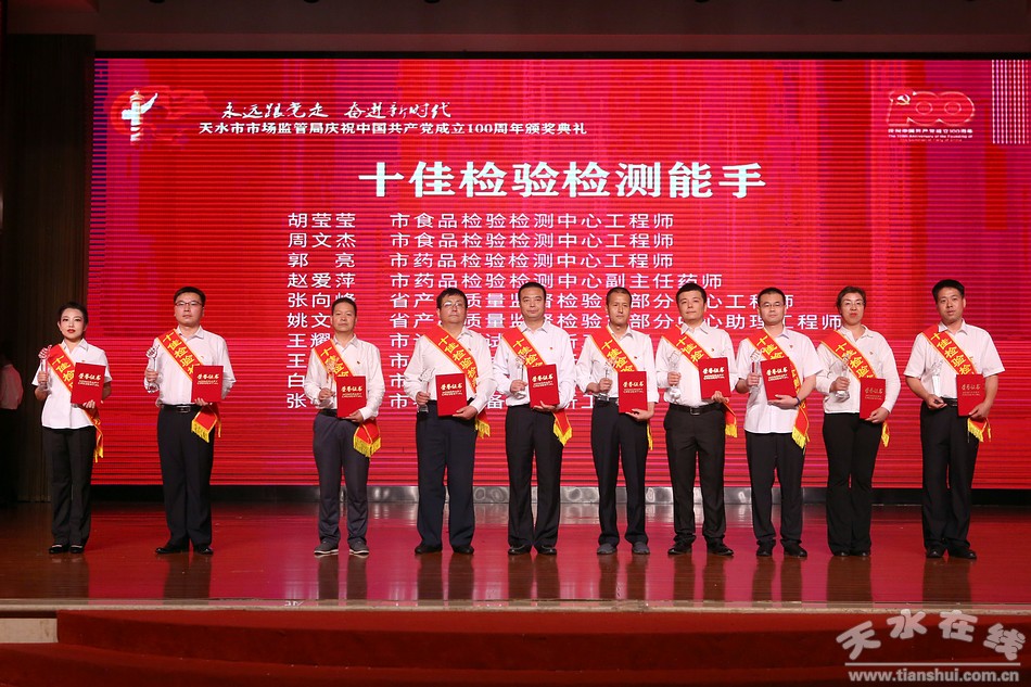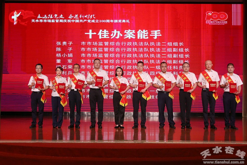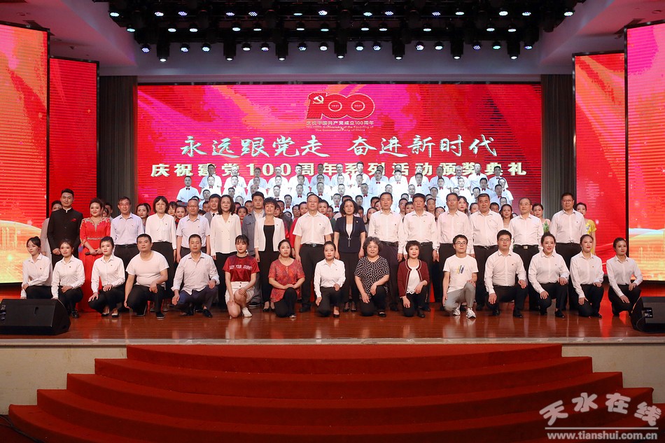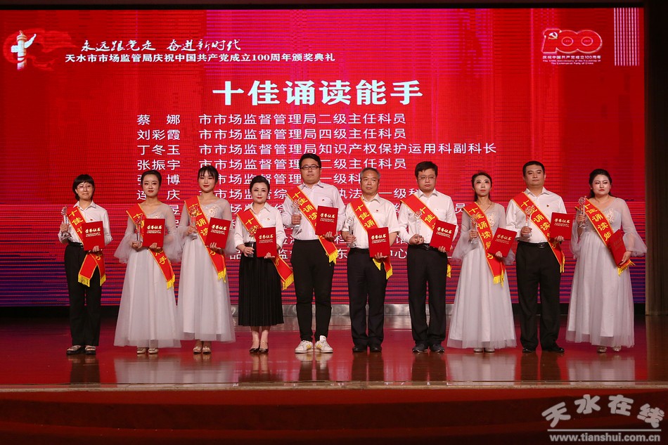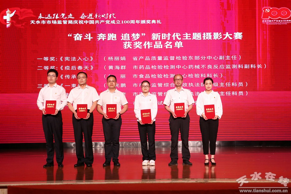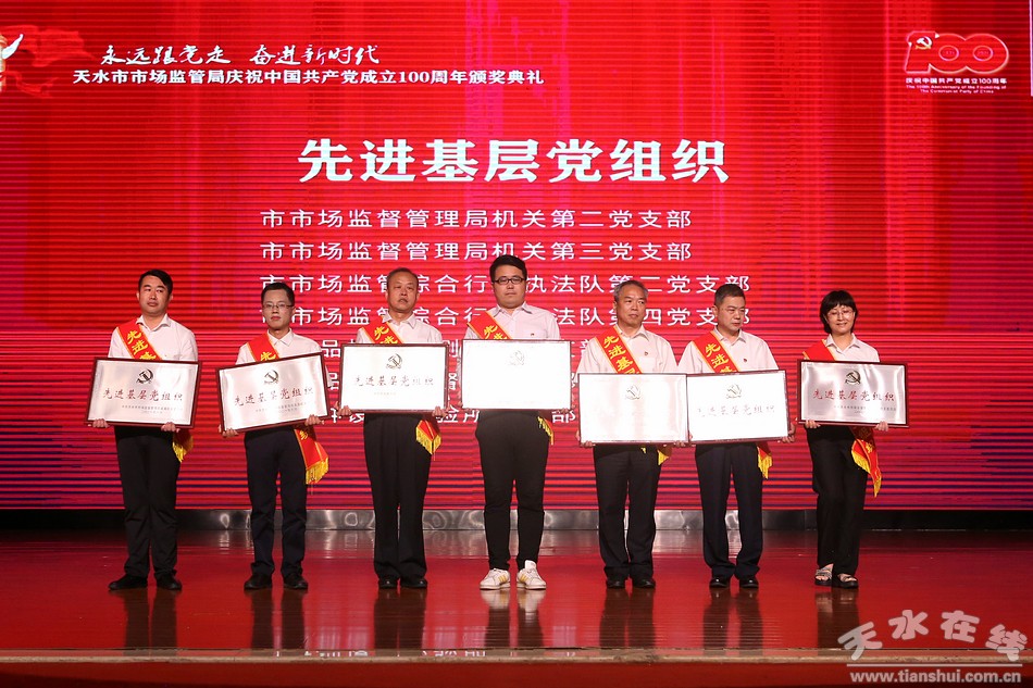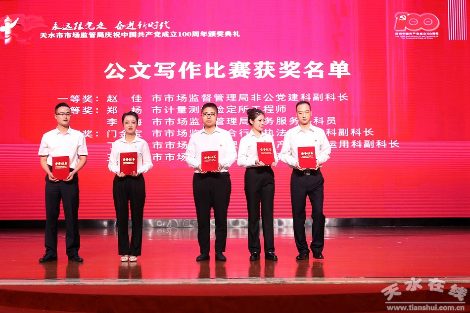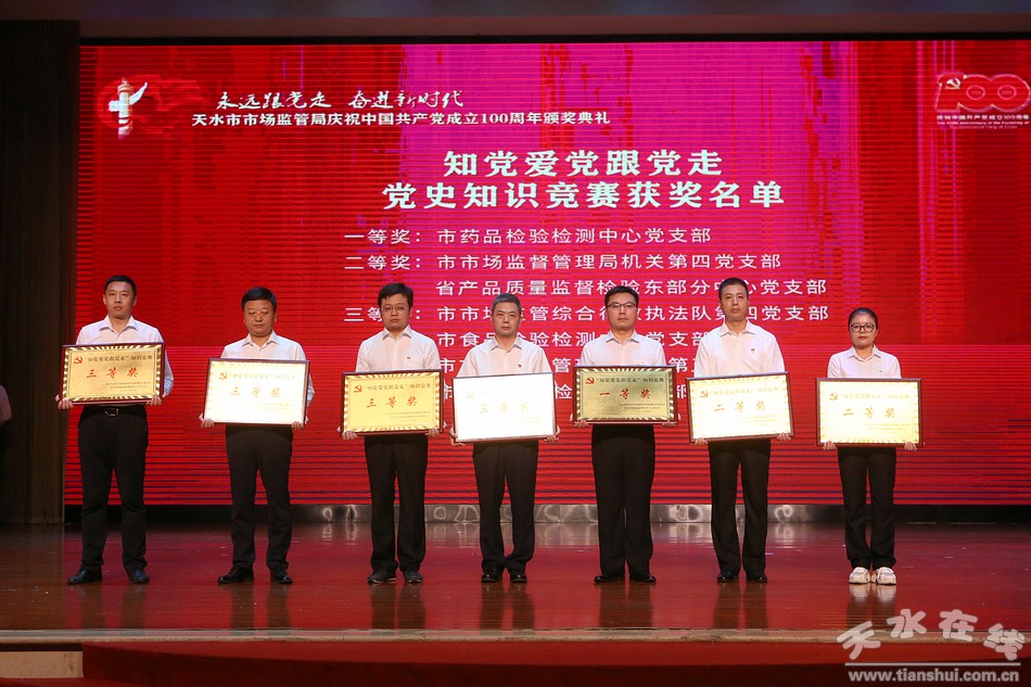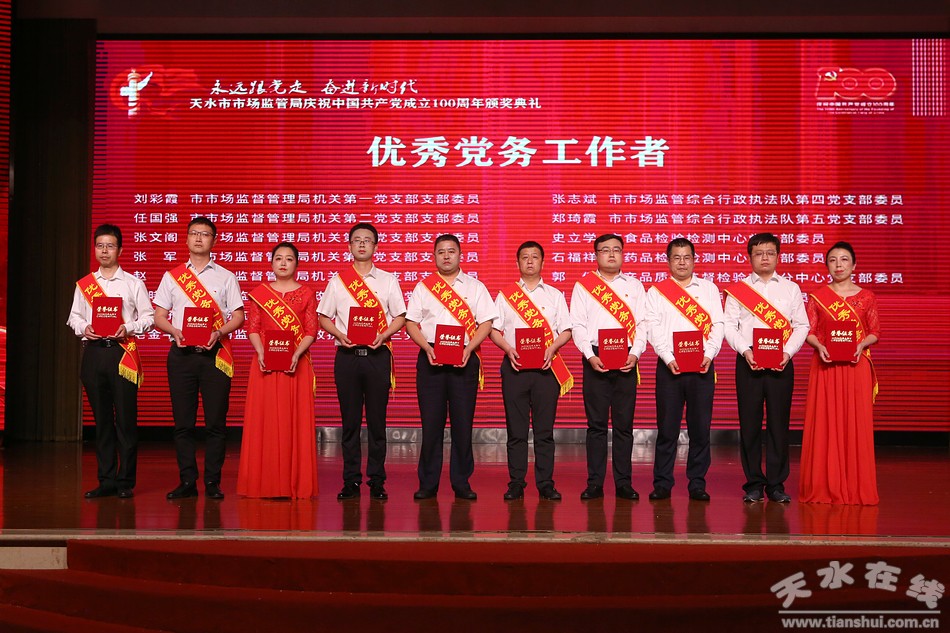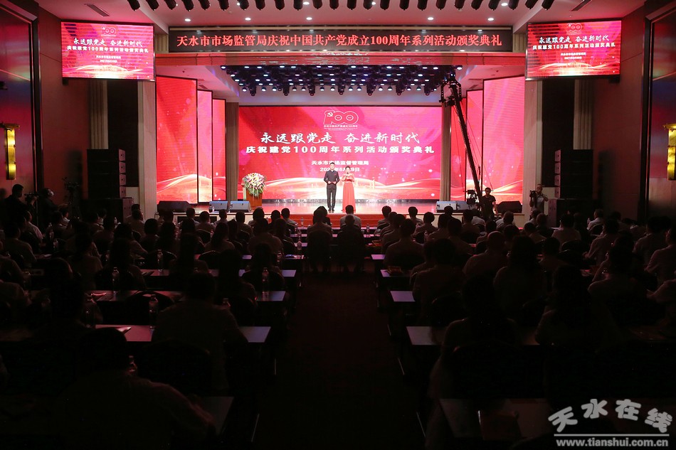 6月29日,天水市市場(chǎng)監(jiān)督管理局舉辦“永遠(yuǎn)跟黨走·奮進(jìn)新時(shí)代”慶祝中國共產(chǎn)黨成立100周年系列活動(dòng)頒獎(jiǎng)典禮。市委常委、組織部部長賈義翔,市委常委、統(tǒng)戰(zhàn)部部長王燕,副市長汪小娟,市政協(xié)副主席王祥林出席頒獎(jiǎng)典禮。
