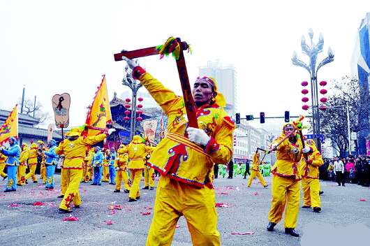 從此以后,每年正月初九,由東關(guān)民眾組成的三架夾板隊,經(jīng)由大城、中城、西關(guān)、伏羲城至玉泉觀進香。這就是演變至今的秦州夾板舞,以此作為獨特的一種進香形式,不過天水人歷來習(xí)慣稱其為“朝山會”。