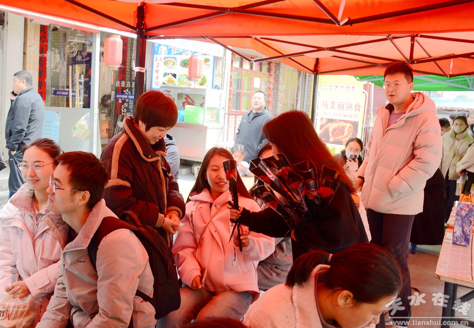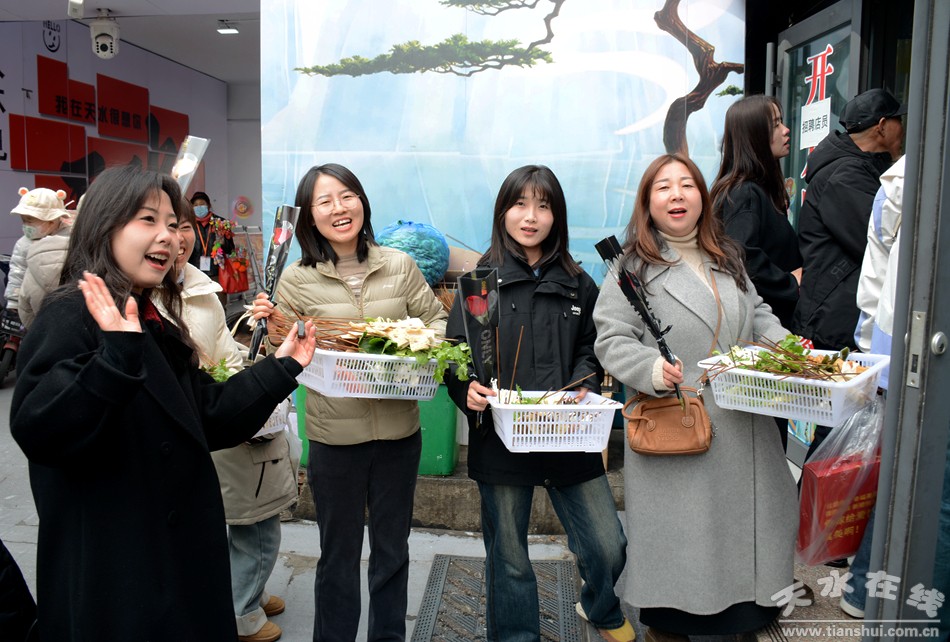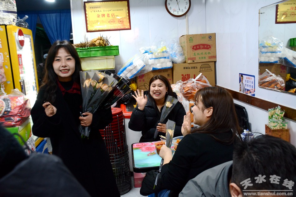 ▲天水在線向打卡“天水麻辣燙”的女游客贈送玫瑰花