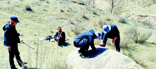 甘谷縣的軍馬場溝門巖畫,亦是此次普查的“重磅發(fā)現(xiàn)”。這處鐫刻于巨型巖石上的遺存,共有四十余個凹窩及十余處字符,其中“天”字結(jié)體規(guī)整,盡顯唐代以后楷書風(fēng)格。巖畫中還有頭戴羽冠的人物起舞圖案,是隴東地區(qū)首次發(fā)現(xiàn)的珍貴古文化遺存。