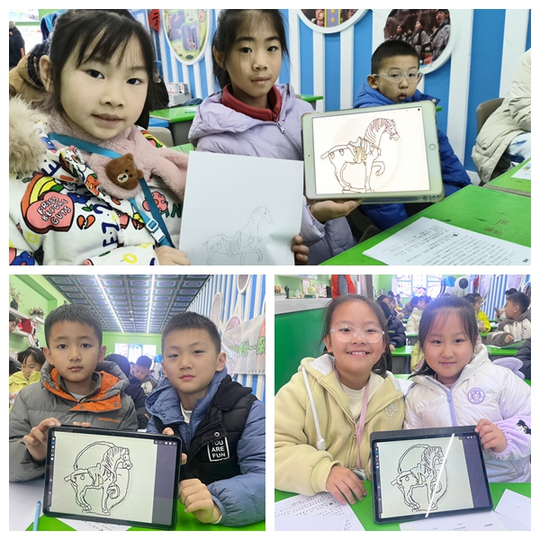 在實踐環(huán)節(jié),引導(dǎo)青少年探索藝術(shù)表達(dá)的多元可能,分兩組開始創(chuàng)作,一組以傳統(tǒng)紙筆為媒介,細(xì)細(xì)勾勒陶舞馬陶俑的形態(tài)神韻,品味筆墨暈染的層次變化與手工線條的獨(dú)特質(zhì)感;另一組借助pad板繪工具盡情揮灑創(chuàng)意,靈活運(yùn)用數(shù)字畫筆便捷的色彩調(diào)配及靈活的圖層編輯功能。創(chuàng)作完成后,大家展示作品、分享感悟,宣教人員總結(jié)紙筆繪畫與pad板繪在創(chuàng)作邏輯、表現(xiàn)形式與審美體驗上的異同,引導(dǎo)青少年辯證看待傳統(tǒng)與現(xiàn)代創(chuàng)作方式的獨(dú)特價值,學(xué)會取長補(bǔ)短、兼容并蓄。